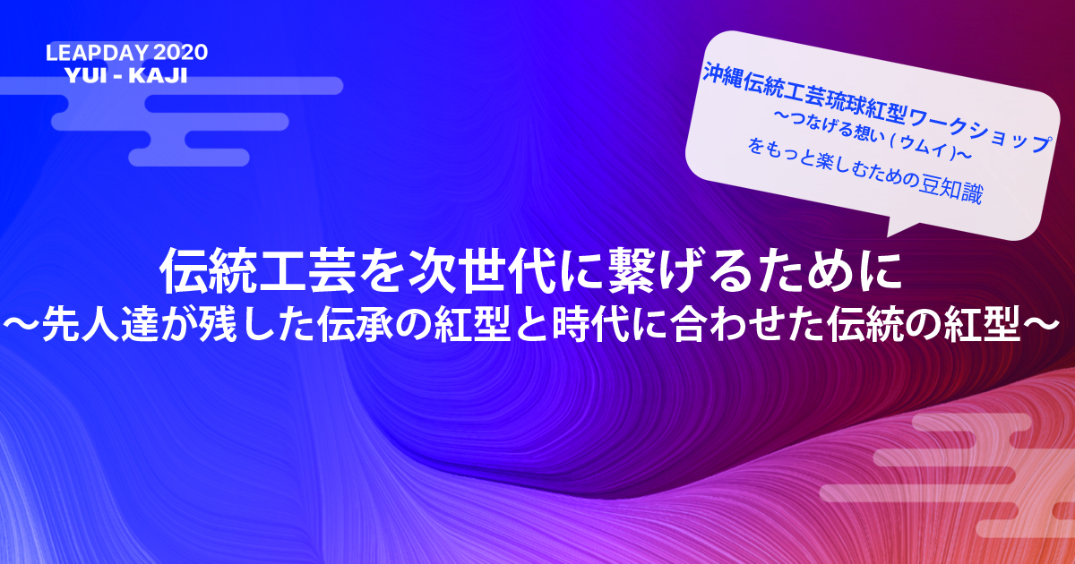 LEAP DAYでは、先人達の想いを受け継ぎ、次世代に想いを「伝承」しながら、歴史を途絶えさせないため時代に合わせた「伝統」を残している紅型職人からワークショップを交えて、様々なお話をお伺いします。