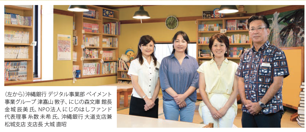 また、2020年3月に子ども食堂「にじの森文庫」を運営するNPO法人にじのはしファンドと「連携・協力に関する協定書」を締結しました。にじの森文庫は、子ども図書館をメインとしながら、共働きや一人親世帯の子どもが一人で食事をとる「孤食」の問題を一緒に解決するため、子ども食堂を併設しています。「子ども食堂=貧困家庭の子が行く」というイメージを取り除き、すべての子どもたちへ利用の機会を広げるため、在住地域や家庭環境などの利用条件は設けず、子どもたちが安⼼して過ごせる“居場所”になることを目指している場所です。沖縄銀行では、支店窓口での資金募集、活動の周知、支援サポーター制度登録に関する事務手続きなどに取り組んでいます。沖縄銀行が提供するアプリ「おきぎんSmart」からのご寄付も可能です。銀行ならではの、県内の強いネットワークを活かし、地域の企業さまや個人のお客さまと同ファンド、そして子どもたちをつなぐハブとして、“顔が見える支援”の連携・協力に取組んでいます。
